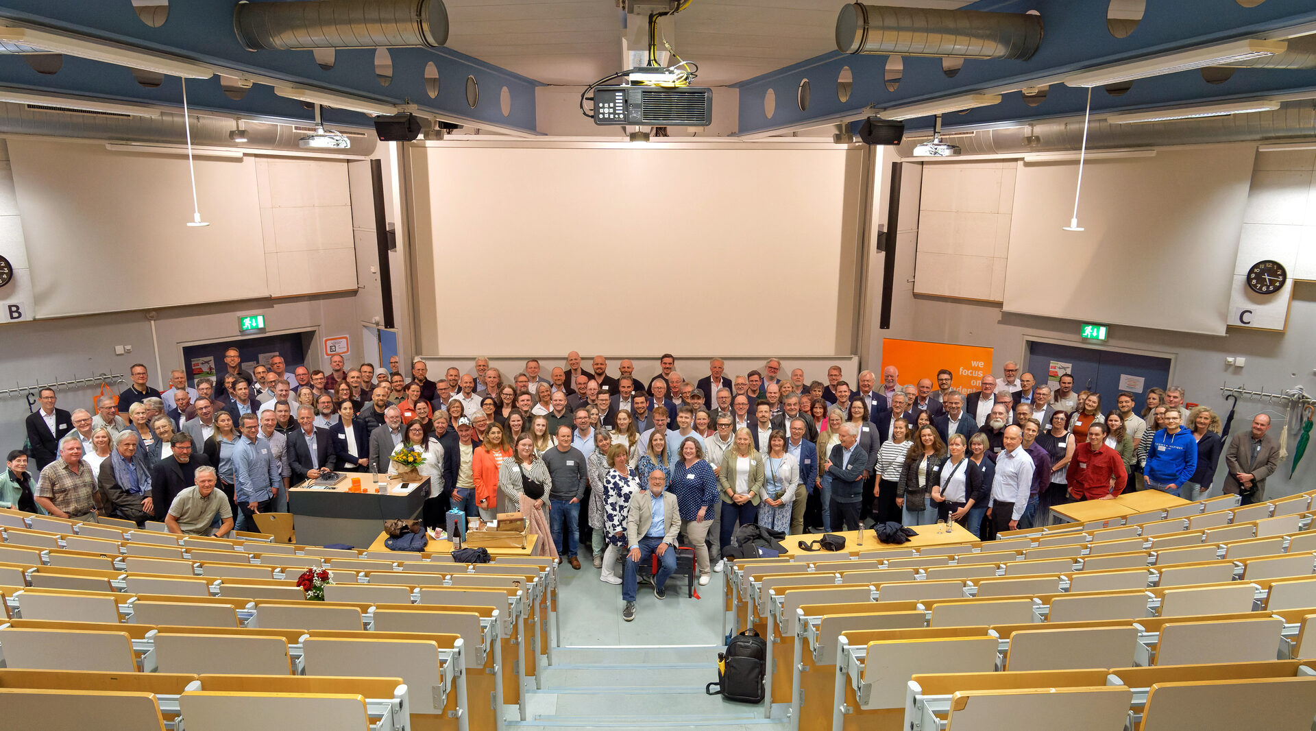 In the end, he had to rush a little to get through the slides on time. "We got lost at the beginning," says Prof. Haas, glancing at his watch. But the 150 guests in the lecture hall, including fellow lecturers, partners from Business Studies and research, friends and family, were happy to forgive him for every extra minute. After the entertaining turbo lecture on the "Value contribution of informatics for patient care", they gave the speaker a long ovation. "This is a brilliant energizer for retirement," says a visibly moved Peter Haas. "Thank you for letting me be here for 30 years."
