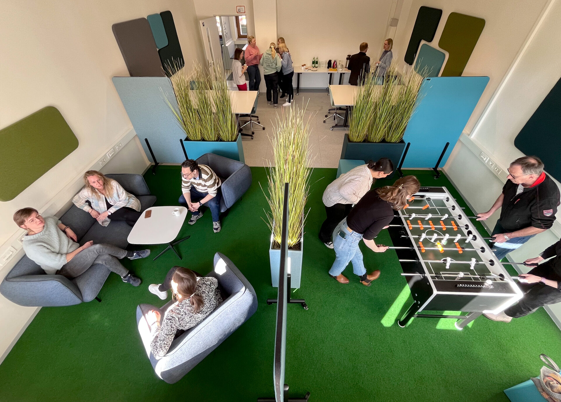 Von den hohen Kunstpflanzenhalmen und den hübschen Schallschluckern in der Raummitte bis zu den Fenstern liegt Kunstrasen, rechts bietet eine großzügige Sofagruppe Platz zum Denken, Atmen und Plaudern. Links steht der Kicker, ein extra geräuscharmes Modell, den Korkball gibt’s gegen Pfand an der Servicetheke. Hinzu kommt ein DeskBike, mit dem durch Muskelkraft Strom zum Aufladen von Smartphone und Co erzeugt werden kann.