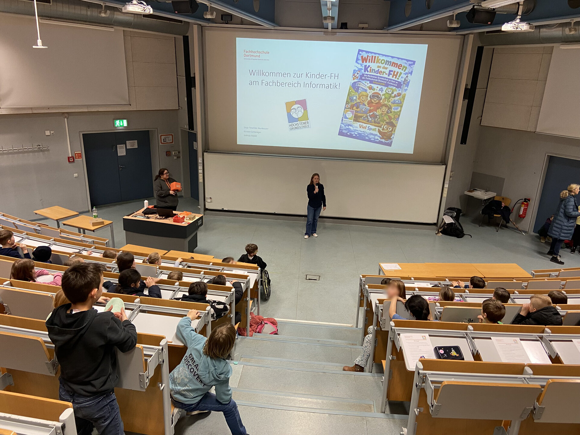 There was already great excitement when the doors to the largest lecture hall on the Informatics campus opened. For many of the children, it was the first time they had experienced such a large lecture hall, which even has a microphone.