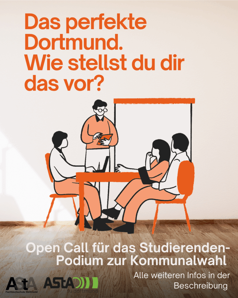 The ASten are looking for five students who would like to represent their view of Dortmund in the first round of discussions. Applications can be submitted by August 25 via email to podiumsdiskussionasta-tu-dortmundde .