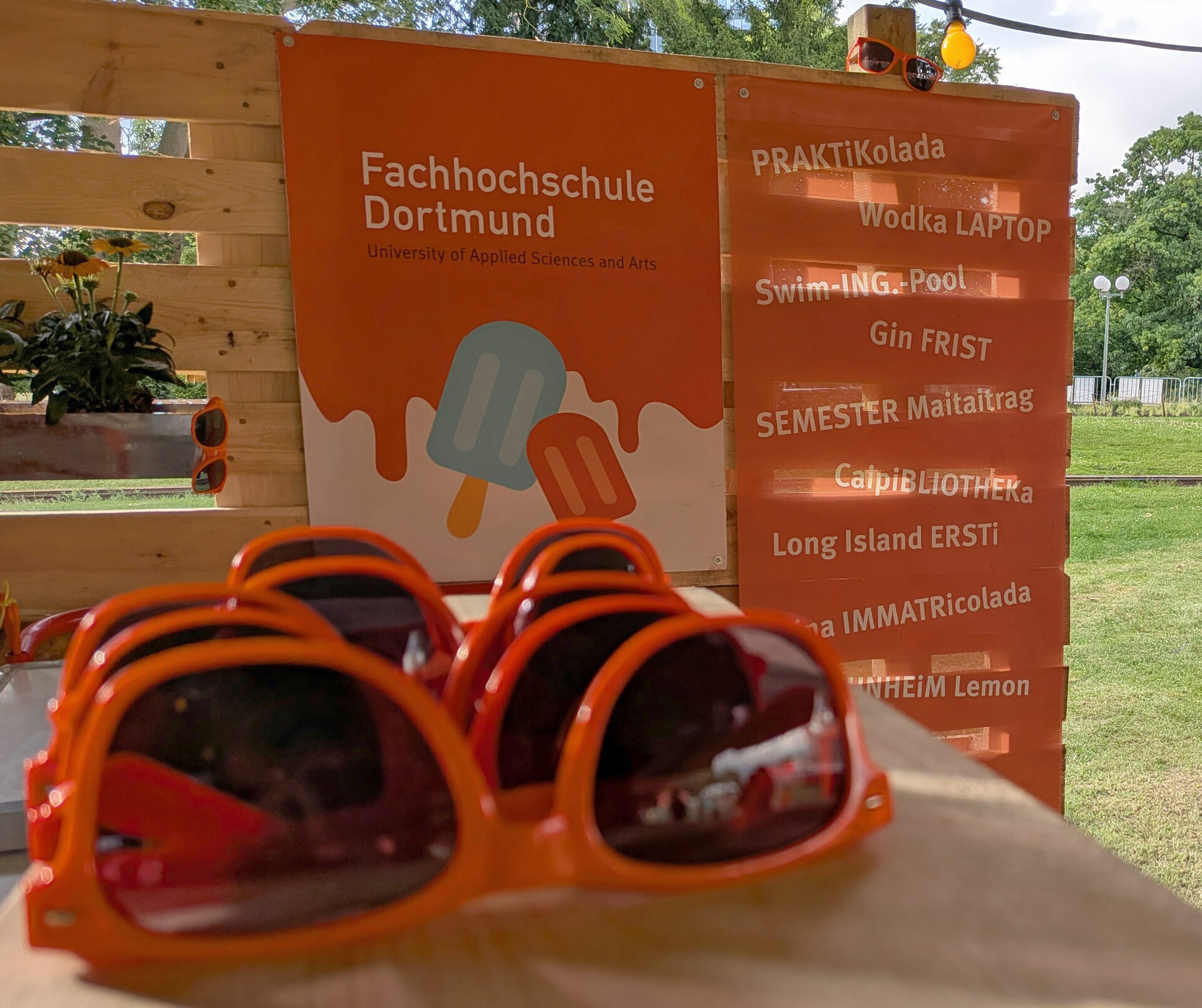Beim „Juicy Beats“ feierten am Wochenende (25./26. Juli 2025) 34.000 Menschen im Dortmunder Westfalenpark mit Live-Acts wie Zartmann, Montez, Alexander Markus und Tream auf der Mainstage und Cari Cari, Milleniumkid, Lari Luke und Kasi auf der zweite Mainstage gegenüber der FH-Lounge. Hier gab es ein besonders beliebtes Accessoire, das immer wieder nachgefragt wurde und nun auf vielen Festivalfotos verewigt ist: die markanten orangefarbenen FH-Sonnenbrillen. Rund 12.000 Brillen verteilten Studierende unter den Festival-Besuchern und versorgten damit auch die Leute, die in gleißender Sonne an den Getränkeständen arbeiteten. Und für Familien mit Kindern sowie für die Sicherheitskräfte hatten die FH orange gebrandete Tuben mit Sonnencreme eingepackt und verteilt.