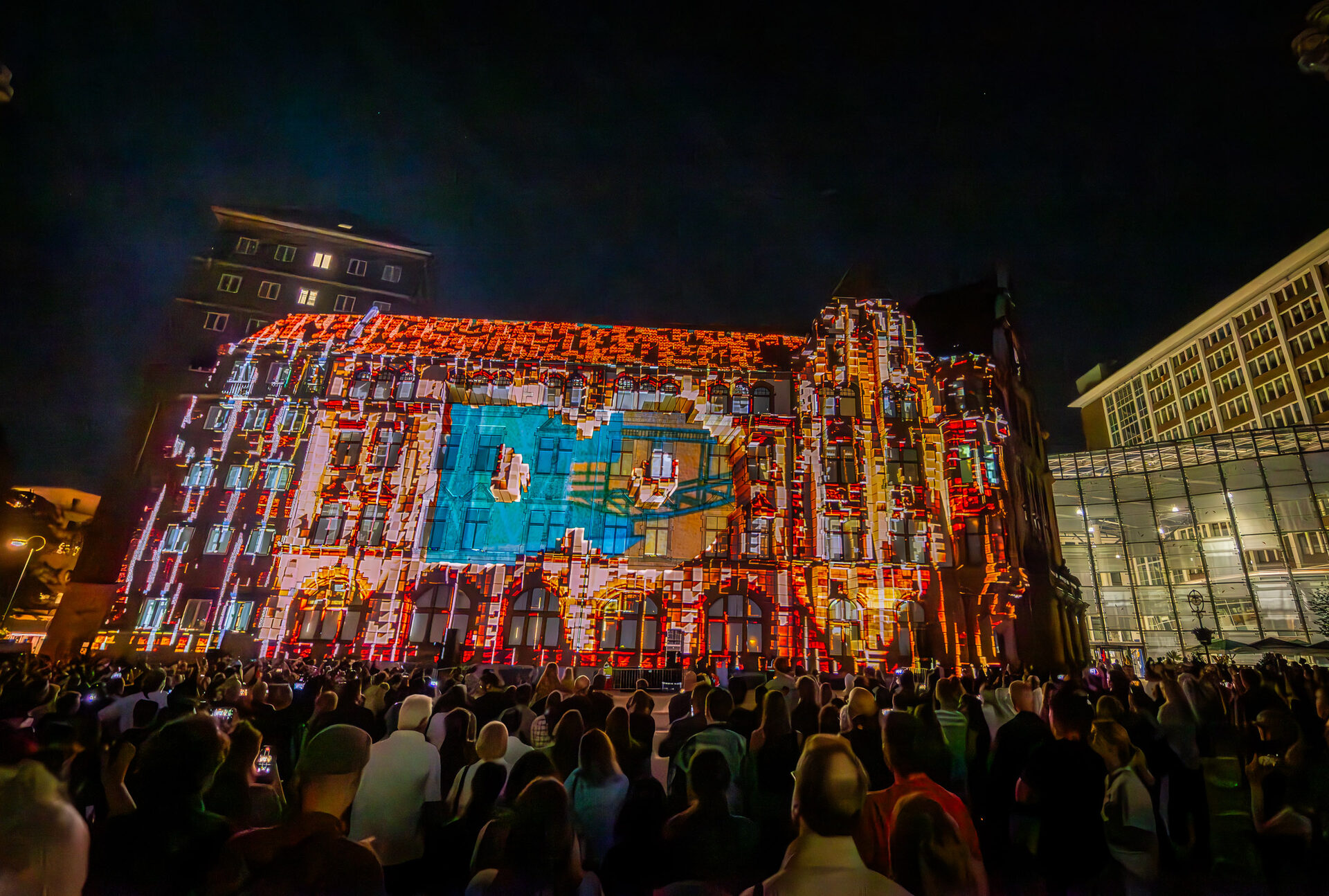 Bereits bei der Auftakt-Party von DORTBUNT am Freitagabend hatte die Fachhochschule ihre Finger im Spiel. Oder besser gesagt ihre Hochleistungsbeamer: Das storyLab kiU (Öffnet in einem neuen Tab) um den künstlerischen Leiter Harald Opel (Öffnet in einem neuen Tab) zauberte mit acht Projektoren eine mitreißende Achterbahnfahrt an die Fassade des alten Stadthauses. Auf dem Friedensplatz verfolgten – kurz vor dem Konzert von Top-Act Max Giesinger – rund 8.000 Besuchende das 3D-Mapping-Spektakel. Das Gebäude wurde dabei scheinbar lebendig und nahm in einer virtuellen Straßenbahn die Umherstehenden mit auf eine rasante Reise in die Vergangenheit, Gegenwart und Zukunft der Stadt.