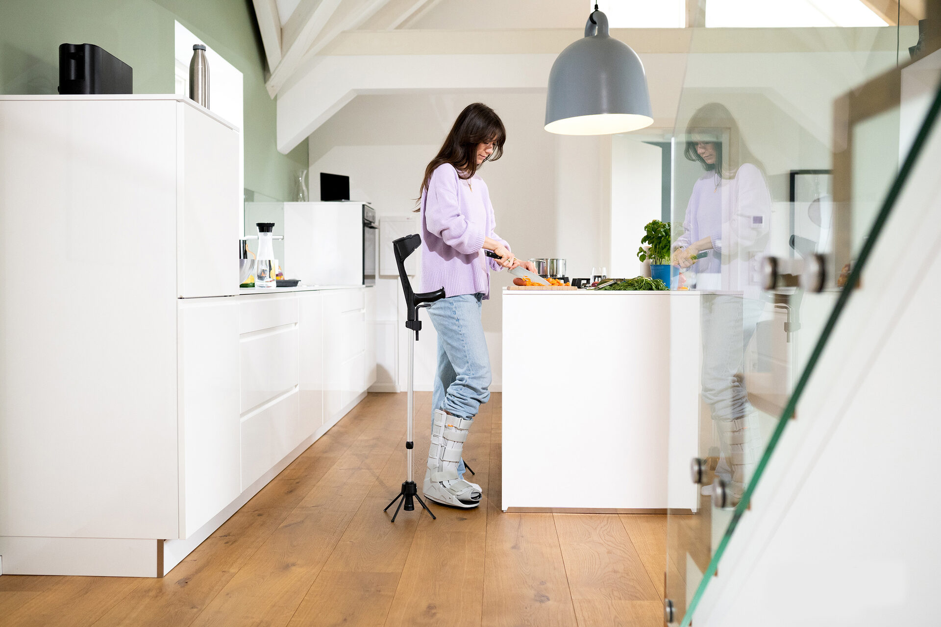 Die Gehhilfe kann so einfach hingestellt werden – etwa, um die Hände zu waschen, oder etwas aus dem Regal zu nehmen. „Wir wollen mit unserem Produkt das Leben von Millionen Menschen einfacher und sicherer machen“, sagt Phil Janßen.