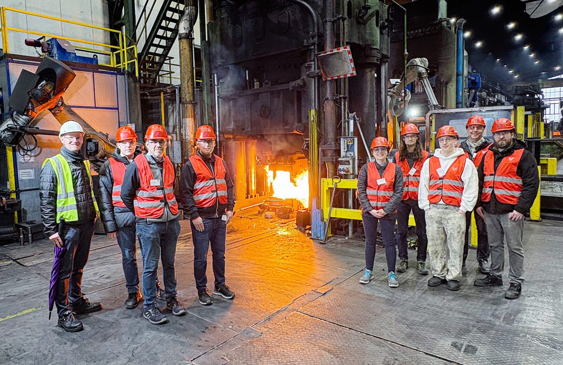 Für die Rückfahrt hatte Prof. Hesterberg eine Werksführung bei der Firma Otto Fuchs in Meinerzhagen organisiert. Das Unternehmen stellt neben Premium-Autofelgen zahlreiche Bauteile für die Luftfahrt aus Aluminium-, Titan- und Nickelbasislegierungen her. Die Teilnehmenden erlebten zahlreiche Fertigungsverfahren in realen industriellen Abläufen: zum Beispiel Stranggießen, Strangpressen, Ringwalzen, Drückwalzen, Gesenkschmieden, Freiformschmieden. „Otto Fuchs bildet geradezu ein Lehrbuch der Fertigungstechnik in der Praxis ab“, fasst Prof. Hesterberg zusammen.