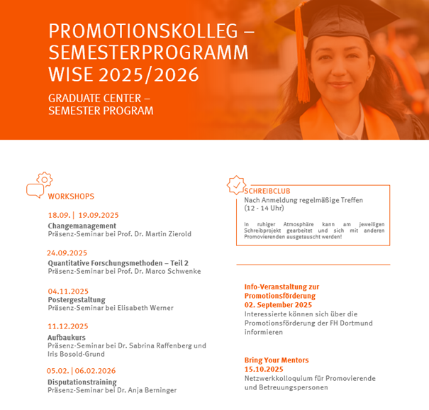 Bei der Bewerbung zur Promotionsförderung lassen wir euch nicht allein. Am 2. September 2025 von 10-11 Uhr bieten wir eine Sprechstunde zur Erstellung der Bewerbungsunterlagen an. Anmelden könnt ihr euch hierfür per Mail an promotionskollegfh-dortmundde . Solltet ihr die Teilnahme verpassen oder noch offene Fragen haben, meldet euch gerne zur individuellen Beratung.
