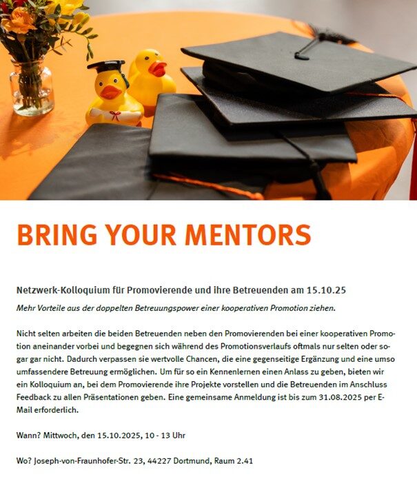 Unsere neue Veranstaltung „Bring Your Mentors“ findet erstmals am Mittwoch, den 15. Oktober 2025, von 10 bis 13 Uhr in Raum 2.41 in der Joseph-von-Fraunhofer-Str. 23, 44227 Dortmund statt.