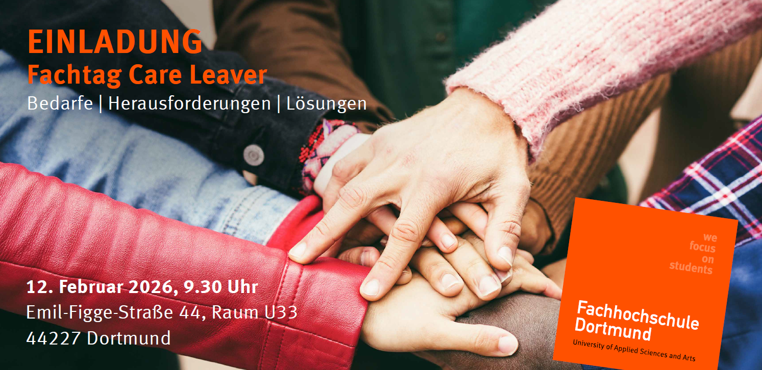 Gemeinsam mit dem Meeting Port (Öffnet in einem neuen Tab) der GrünBau gGmbH findet am Donnerstag, den 12.02.2026 der Care Leaver-Fachtag im Fachbereich Angewandte Sozialwissenschaften (Öffnet in einem neuen Tab) der Fachhochschule Dortmund statt.